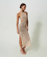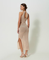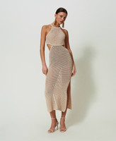 Long dress made from cotton and linen blend mesh with sparkling dots, halter neck, cutout on the sides, side slits, lining.