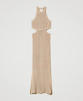 Glamorous knitwear is best expressed by this fitted dress made from mesh cotton and linen with sparkling dots. Sleeveless, with halter neck and cutout on the sides, side slits, teardrop opening and metal Oval T logo plate on the back, lining. Wear it with dramatic earrings for a special evening.