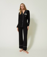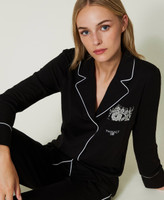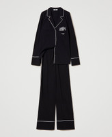 Perk up your nightwear range with these mannish pyjamas made from cotton jersey interlock with contrasting piping. The tunic features collar with lapels, two-tone lace insert at the pocket, contrasting logo, logo buttons. The trousers have elasticated waist and piping trim on the sides and hem. The perfect synthesis of elegance and comfort.