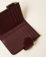 Medium smooth faux calfskin leather wallet with metal lettering logo. Strap and snap button closure, L-shaped zip, internal compartments for documents, card holder slots and coin pocket.