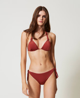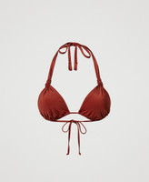 Ruched triangle bikini top, with removable padding. Tubular straps can be self tied behind the neck or turned into shoulder straps using the eyelet ends. Back self-tie.