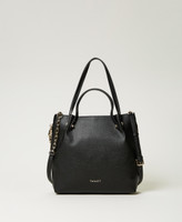 Leather-like shopper with natural calf grain, double handle for on-shoulder and hand carrying, removable strap, side zips.