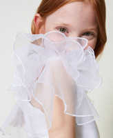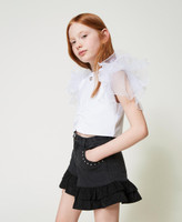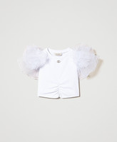 Stretch cotton jersey T-shirt with voluminous organza sleeves, gathered at the front, Oval T logo plate.