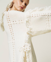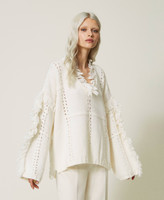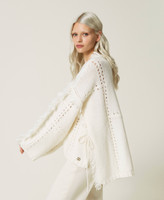 Alpaca and wool blend poncho jumper, with patchwork-like openwork, wide fit, V neck, slits with fringes.