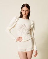 Wool blend jumper with crochet effect open work at the front. Round neck, long sleeves gathered at the armholes, ruffles at the cuffs, scalloped hem, fitted.