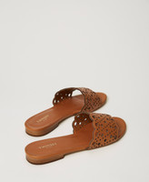 Leather slides with decorative lasered motifs on the band and tunit sole.