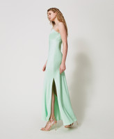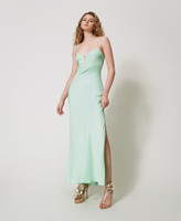 Long shiny viscose satin dress with thin shoulder straps, deep neckline, side slit, Oval T logo plate at the back, fitted. This dress is perfect for a formal occasion.
