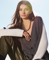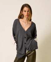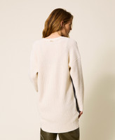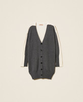 Long wool and cotton blend double knit cardigan, plain knit front and contrasting colour corn stitch on the back and half way down the sleeves. V neck, long sleeves, logoed button fastening, ribbed trim, loose fit. The cotton used for this garment (24% cotton) is organic, therefore it may contain natural impurities as it did not undergo any chemical treatments. This item is part of the “Archive” range, inspired by the most iconic and most loved garments from the Twinset collections.