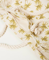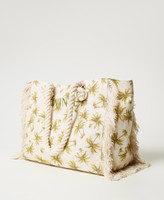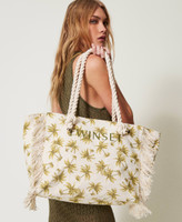 Beach shopper bag made from cotton canvas frayed on the sides with all-round print, handles made from natural twist rope for on-shoulder wear, zip closure, contrasting lettering logo, lightweight, unlined.