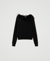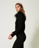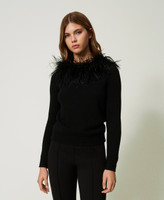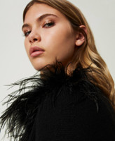 - 33% viscose 23% polyamide 20% cotton 20% wool 4% cashmere. Removable collar: 100% polyester. Trim: 100% ostrich feather. Trim 2: 100% turkey feathers.