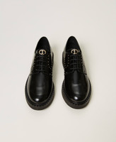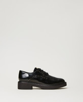 Leather tie-up derby shoes with micro studs around the edges and rubber sole.