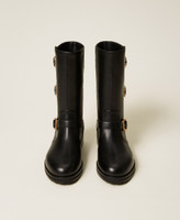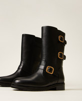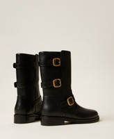 Biker boots with square metal buckles, drainpipe leg and tunit sole.