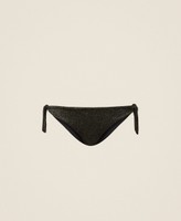 Lurex fabric thong with traps that tie at the sides, solid colour lining and heart-shaped metal logo on the back.