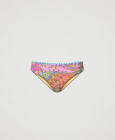 Brazilian bikini bottom with print and cotton crochet trim around the edges, heart-shaped logo on the back, lining.