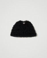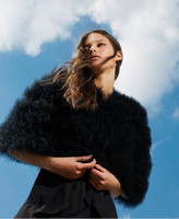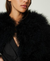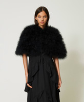Complete your special occasion looks with this cape made from embroidered fabric with feathers, round neck, hook closure and lining. A perfect shrug finish for elegant dresses but also a last furry layer for coats and jackets.