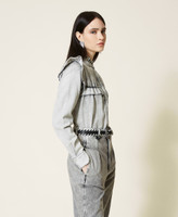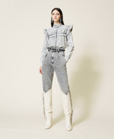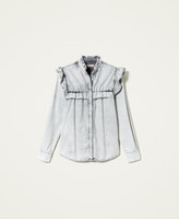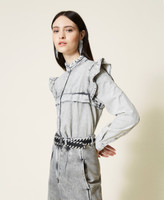 Denim shirt with marbled treatment accentuated on the seams, ruffled sleeves.