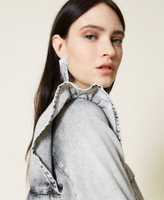 Elegance meets urban attitude in this light denim shirt with marbled treatment accentuated in the seams and thicker parts of the finished garment. Ruffled neckline and shoulders, mother of pearl-like snap button closure, long sleeves with cuff and button. One of the cult garments in your seasonal looks.