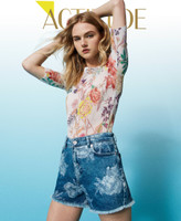 Actitude collection high waist shorts made from dark blue denim with rose laser print, five pockets, zip and button.