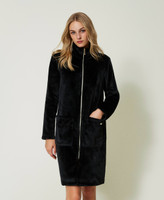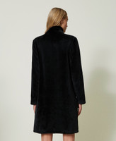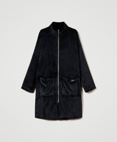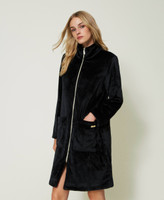 Faux fur dressing gown with turtleneck, long sleeves, appliquéd pockets, zip closure.