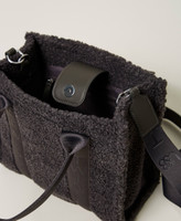 Shopper bag made from faux fur with ribbons and removable shoulder strap. Heat-printed logo, tonal double handle, zip closure, leather-like details.