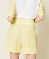 The stars of the top summer outfit, the coolest shorts are high waist, made of embossed two-tone gingham fabric with waistband, hook closure, mannish flap and nylon zip, front pleats, side pockets. Perfect with matching blouse and flat sandals.