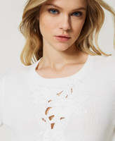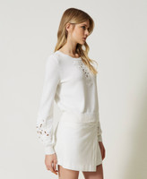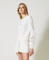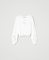 Precious cotton jumper with placed broderie anglaise-like embroidery with handmade crystal bead and coral finish, loose fit. Loose fit, round neck, long sleeves, ribbed hem, Oval T logo plate on the back. Simply wear it, and your look will become unique.