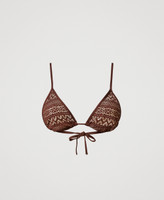 Triangle bikini top with geometric pattern lace effect. No padding, lining, straps can be self tied behind the neck or turned into shoulder straps using the eyelet ends. Back self-tie.