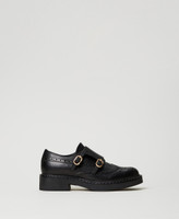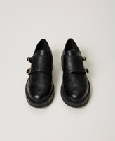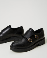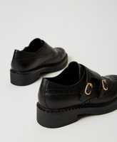 Mannish monk strap leather shoes with Brogue detail and rubber sole.