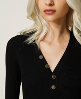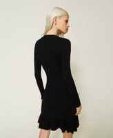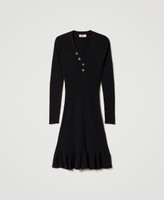 Stretch viscose short dress with mixed ribbing, wide V neck with buttons, long glove sleeves, godet flounce at the hem.