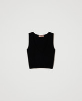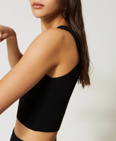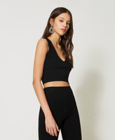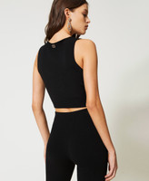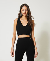 Seamless stretch viscose knit cropped top, fitted, sleeveless, with ribbed hem.