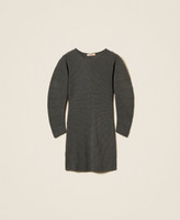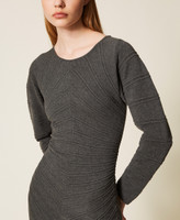 Short viscose blend knit dress with diagonal stitch work that creates a pattern and defines the silhouette. It has a round neck, slightly wide long sleeves, Oval T logo plate on the back, fitted.