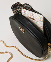 Saffiano print leather effect for this set composed by mini shoulder bag, heart-shaped envelope and flat card holder with metal logo.