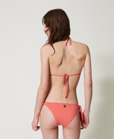 Triangle bikini top with laces finished with pearls and knots. Padded with detachable cups, it has laces that tie behind the neck or work as shoulder straps thanks to eyelets at the ends, plus side boning and tie fastening on the back.