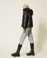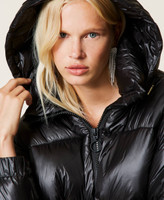 An ally against the cold that will get noticed. This short puffer jacket is made of ultra-light technical fabric with horizontal quilting and special molecular fibre padding that creates a feather-like effect. Drawstring at the hood, die-cast zip closure, flap pockets with side opening, adjustable cuffs and drawstring at the hem. Match it with jeans and ankle boots for the city.