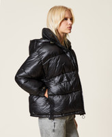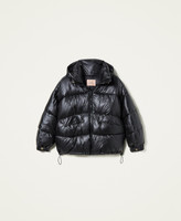 Short puffer Jacket made of ultra-light technical fabric with horizontal quilting, hood and drawstring at the hem.