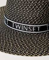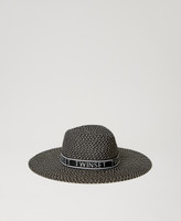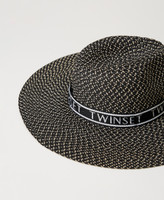 Two-tone raffia-like wide brim hat with jacquard logo ribbon, drawstring to adjust.