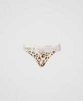 Animal print satin g-string with raw cut lace on the waistline and sides.