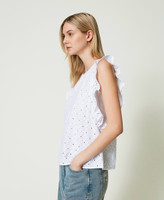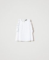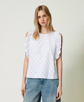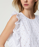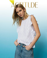 Actitude collection broderie anglaise cotton top with round neck, ruffled wing sleeves, teardrop closure on the back.