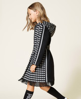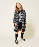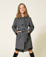 An unmissable touch of trend for all your little girl's outfits. This yarn-dyed wool cloth coat with check pattern in front and solid colour on the back features a wool fringe trim at the hem. Straight fit, with hood, button closure, appliqued pockets, removable matching belt and lining with logo all over. A perfect coat for many occasions.