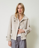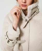 Faux shearing and nappa jacket, with tonal inside/out details. Collar can be closed with buckle and frog fastener, long sleeves with slouched shoulders, straps at the cuffs, concealed zip fastening, side pockets, buckle and frog fasteners at the hem, Oval T plate at the back, no lining, straight fit.