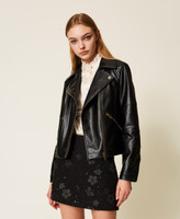 Faux leather biker jacket with double-stitched seams. Wide lapels, asymmetric metal zip fastening, welt pockets and zipped cuffs, lining, straight fit.