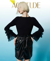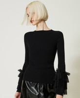 Actitude collection fitted jumper made from modal blend yarn, with pleated tulle flounces at the cuff, round neck, fitted.