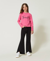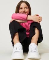 A brand new fit for these Girls’ flared trousers made from bull with zip and snap button, five pockets, slanted raw cut frayed hem, lettering logo plate. A stylish new look for school and play time.