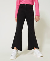 Cotton bull trousers, flared, with five pockets, zip and snap button, asymmetric frayed hem.