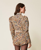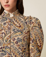 Short jacquard jacket made in Italy with cashmere pattern, a design exclusive to Twinset. Made with thick and thin threads to create a mat-effect texture. Mandarin collar, long wide sleeves gathered at the armholes with ruffles, fitted fastening with hooks, lining, fitted.