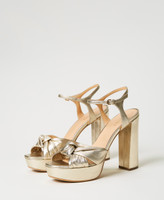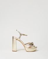 Laminated leather sandals with knot in front, ankle strap, platform, cylinder heel and tunit sole.