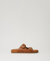 Let these stylish leather slides take you everywhere, with their double band and metal buckles, lace-like lasered upper and tunit sole. A versatile attitude and an iconic personality that are easy to match.