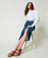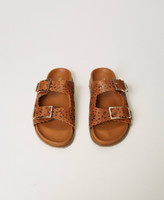 Leather slides with double band and metal buckles, lace-like lasered upper and tunit sole.