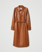 Leather-like trench coat with rear slit, double-breasted button closure and matching belt.