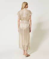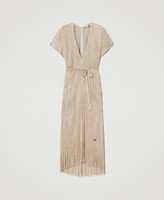 Long viscose and lurex poncho with chevron pattern, short sleeves, removable belt and fringed hem.